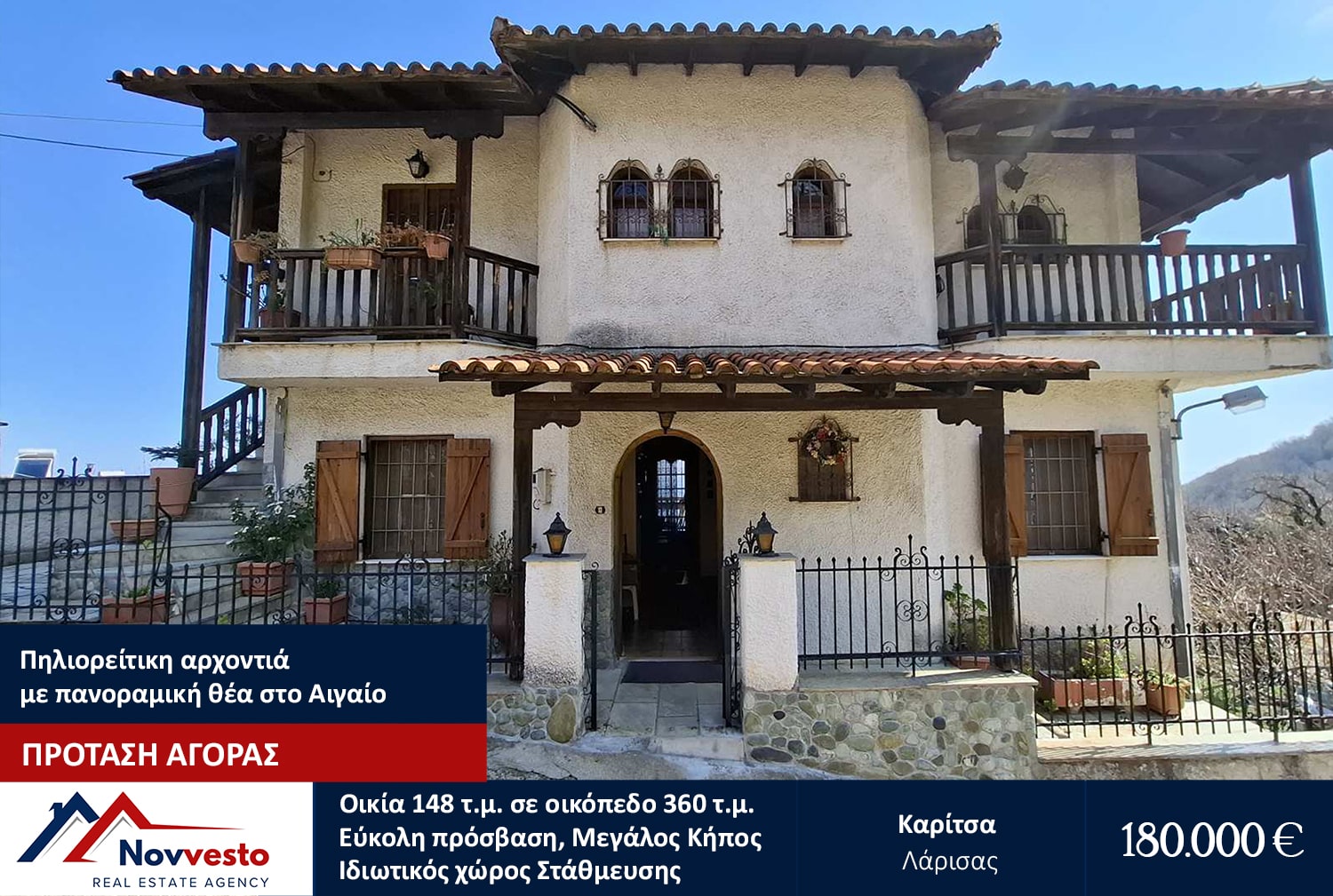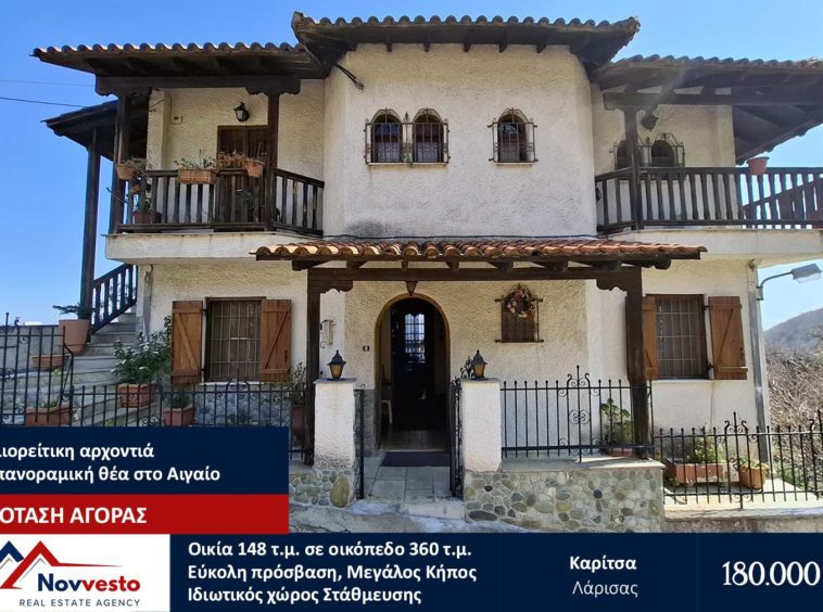 Στον μαγευτικό οικισμό της Καρίτσας, του Δήμου Αγιάς — γνωστό και ως “το μπαλκόνι του Κισσάβου” — διατίθεται προς πώληση μια μοναδική κατοικία 148 τ.μ. σε οικόπεδο 360 τ.μ., η οποία συνδυάζει την παραδοσιακή πηλιορείτικη αρχιτεκτονική με εντυπωσιακή θέα προς το Αιγαίο και τον απόλυτο σεβασμό στο φυσικό τοπίο.